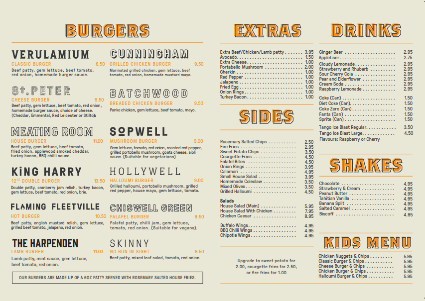 Starting with the Verulamium (Classic Burger), priced at £9.50, this classic option delivers all the traditional goodness one expects from a burger, with a juicy beef patty served in a soft bun. For cheese lovers, the St. Peter (Cheeseburger) at £10.50 adds a rich layer of melted cheese to the mix, making it even more indulgent. If you're looking for something a bit different, the King Harry ST. PETER’S (Cheese Burger) is another variation that promises the perfect balance of savory cheese and tender beef at £10.50 as well.